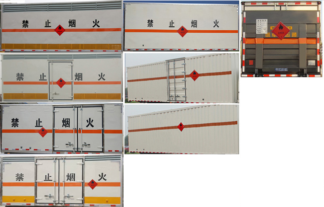 整車(chē)備注:廂體頂部封閉,不可開(kāi)啟.該車(chē)主要用于運(yùn)輸獨(dú)立容器包裝的介質(zhì):乙醛,甲(乙)苯,丙酮,樟腦油,二硫化碳,二丁醚,甲(乙)醇,液體粘合劑,涂料或涂料溶液,甲醛溶液,印刷油墨,類(lèi)項(xiàng)號(hào)均為3;ABS系統(tǒng)型號(hào):ECU:4460043200;電磁閥:4721950180,廠家為威伯科汽車(chē)控制系統(tǒng)(中國(guó))有限公司;隨底盤(pán)選裝駕駛室;廂體選裝瓦楞板結(jié)構(gòu),廂體側(cè)面選裝開(kāi)門(mén)型式及位置或不帶側(cè)開(kāi)門(mén),選裝百葉窗,廂體顏色可變化,選裝液壓升降尾板(收起狀態(tài)水平長(zhǎng)度為290mm);選裝側(cè)門(mén)對(duì)應(yīng)外形尺寸寬度2260mm,不帶側(cè)門(mén)對(duì)應(yīng)寬度2200mm;僅選用前盤(pán)式制動(dòng)器,前置排氣管,子午線(xiàn)輪胎,限速裝置的底盤(pán).側(cè)面防護(hù)及后下部防護(hù)裝置材料材質(zhì):Q235,連接方式:焊接加螺栓連接;后下部防護(hù)裝置斷面尺寸(寬×高):50×100(mm),離地高度:430mm.安裝具有衛(wèi)星定位功能的行駛記錄儀.
